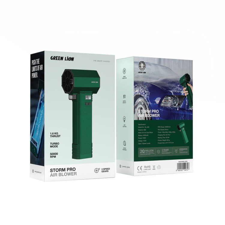 دمنده هوای Green Lion Storm Pro به رنگ سبز: ابزاری تخصصی برای کارهای جدی با هوا. با موتور کانالی ۶۴ میلیمتری و توربوفن خود که با سرعت برقآسای ۵۰۰۰۰ دور در دقیقه کار میکند. ۷۵۰ وات و ۱۶.۸ ولت، جریان هوای فوقالعادهای را فراهم میکند که میتوان آن را در سه سطح سرعت تنظیم کرد و تقریباً برای هر کاری آماده است.