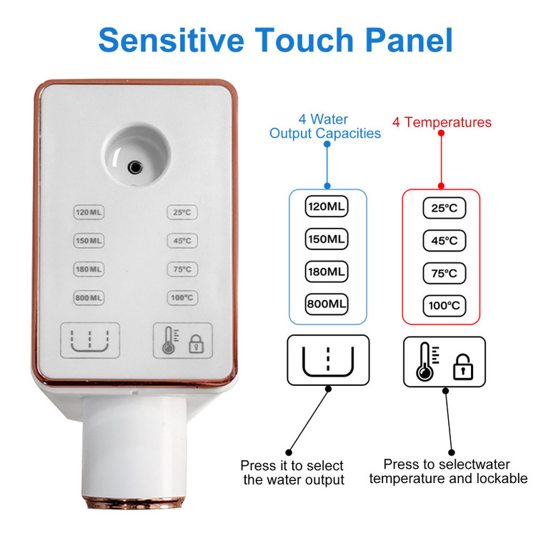 قابل تنظیم شما می توانید دما، مقدار و دوز را تنها با یک فشار یک دکمه، با 4 تنظیم دما (25 درجه سانتی گراد / 45 درجه سانتی گراد / 75 درجه سانتی گراد / 100 درجه سانتی گراد) تنظیم کنید. و 4 گزینه خروجی آب (120ml/150ml/180ml/800ml) برای رفع نیاز آب در زندگی روزمره.