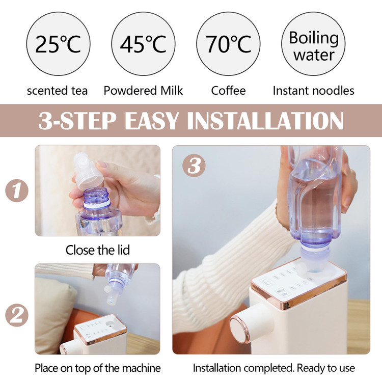 کاربرد گسترده: سه راه برای استفاده از دستگاه پخش کننده آب گرم فوری وجود دارد. یکی نصب آن با مخزن آب، دیگری نصب آن با بطری آب و سومی در آن بطری آب معدنی. مورد استفاده در ادارات، مدارس، هتل ها، خوابگاه ها، مسافرت، کمپینگ و آشپزخانه.